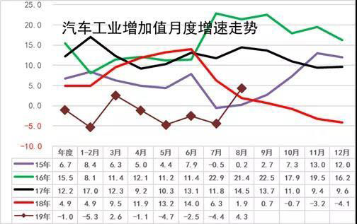 19年1-8月的汽車增加值-1.8%,仍處近期低位。18年增5%.。19年1-8月汽車業(yè)增加值是低于于制造業(yè)增加值平均水平,為制造業(yè)穩(wěn)增長貢獻不大。
