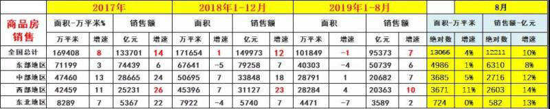1—8月份,東部地區(qū)商品房銷售面積35317萬平方米,同比下降4.2%,降幅比1—6月份收窄0.4個百分點;銷售額44429億元,增長5.2%,增速加快0.5個百分點。中部地區(qū)商品房銷售面積25106萬平方米,下降0.1%,降幅收窄0.4個百分點;銷售額17966億元,增長6.7%,增速加快0.6個百分點。西部地區(qū)商品房銷售面積24613萬平方米,增長2.8%,增速加快0.5個百分點;銷售額17760億元,增長9.3%,增速加快0.9個百分點。東北地區(qū)商品房銷售面積3747萬平方米,下降7.8%,降幅收窄0.5個百分點;銷售額3007億元,增長0.5%,增速回落0.4個百分點。