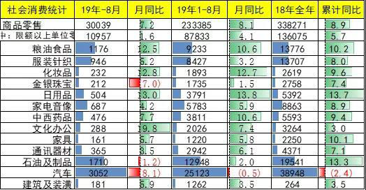 2019年1-8月份,社會消費品零售總額262179億元,同比增長8.2%。其中,除汽車以外的消費品零售額237056億元,增長9.1%。。