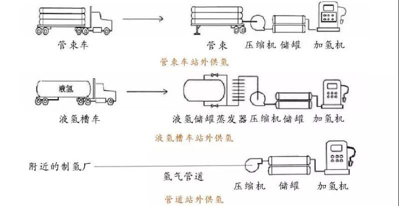 外供氫加氫站內(nèi)無(wú)制氫裝置,氫氣通過(guò)長(zhǎng)管拖車(chē)、液氫槽車(chē)或者氫氣管道由制氫廠運(yùn)輸至加氫站,由壓縮機(jī)壓縮并輸送入高壓儲(chǔ)氫瓶?jī)?nèi)存儲(chǔ),最終通過(guò)氫氣加氣機(jī)加注到燃料電池汽車(chē)中使用。