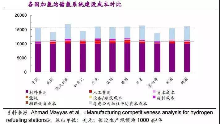 各國(guó)儲(chǔ)氫系統(tǒng)建設(shè)成本比較: