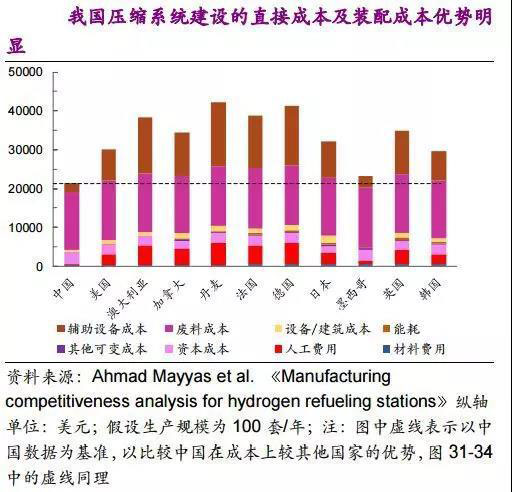 (1)我國(guó)壓縮系統(tǒng)建設(shè)的直接成本和裝配成本在國(guó)際上具有明顯優(yōu)勢(shì),明顯低于美國(guó)、日本、德國(guó)等氫能利用更為廣泛的國(guó)家;