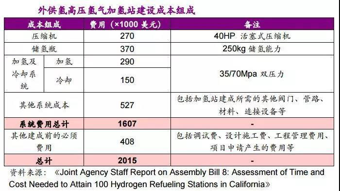 加州能源局的研究數(shù)據(jù)表明,該類型加氫站建成所需的與設(shè)備相關(guān)的費(fèi)用約為160萬(wàn)美元,考慮投入使用前所需的調(diào)試費(fèi)用、工程設(shè)計(jì)費(fèi)用、管理費(fèi)用、建筑施工費(fèi)用等其他費(fèi)用,總成本將超過(guò)200萬(wàn)美元。