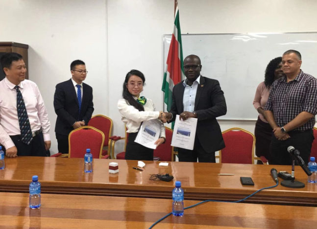 中國儲能網(wǎng)訊:蘇里南當(dāng)?shù)貢r間2019年09月13日中午12點整,公司與蘇里南自然資源部簽訂蘇里南胡亞巴和皮金斯萊村微電網(wǎng)光伏(一期)項目總承包合同。中國駐蘇里南大使劉全、中國駐蘇里南商務(wù)參贊陳宗偉,與蘇里南本國相關(guān)主流媒體共同見證簽約儀式。
