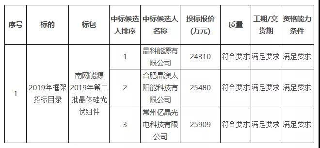 近日,南網(wǎng)能源發(fā)布2019年第二批晶體硅光伏組件結(jié)果公示,晶科、晶澳、常州億晶分別以24310萬(wàn)、25480萬(wàn)、25909萬(wàn)成為中標(biāo)候選人,均價(jià)分別為1.87元/W、1.96元/W、1.99元/W。