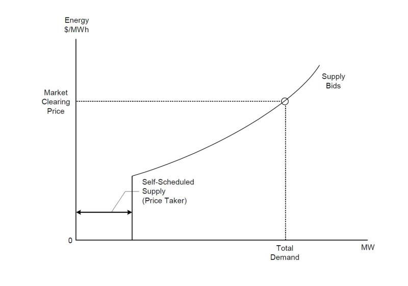 圖5顯示了現(xiàn)貨能量市場(chǎng)出清的過(guò)程。把所有機(jī)組全電量能量報(bào)價(jià)匯總得到了圖5中的供應(yīng)曲線,所有的負(fù)荷全電量能量報(bào)價(jià)匯總得到了圖5中的需求曲線。市場(chǎng)首先出清中長(zhǎng)期合同(自計(jì)劃)部分,然后在經(jīng)濟(jì)報(bào)價(jià)部分找到市場(chǎng)均衡點(diǎn),設(shè)置市場(chǎng)清理價(jià)。中長(zhǎng)期合同或自計(jì)劃不能設(shè)定市場(chǎng)清理價(jià),他們是市場(chǎng)清理價(jià)的接受者(Price Taker)。當(dāng)然市場(chǎng)出清的結(jié)果要能通過(guò)安全校核,如果市場(chǎng)出清的結(jié)果會(huì)引起網(wǎng)絡(luò)阻塞,必須進(jìn)行減載(Curtailment)處理,有時(shí)候?yàn)榱吮WC系統(tǒng)的安全運(yùn)行,不得不對(duì)中長(zhǎng)期合同部分進(jìn)行減載,不能完成中長(zhǎng)期合同的執(zhí)行(至于如何執(zhí)行這種減載,筆者將另文《中長(zhǎng)期交易與現(xiàn)貨交易銜接機(jī)制》,不在這里詳細(xì)討論)。中長(zhǎng)期合同部分可以按合同進(jìn)行結(jié)算,超出合同或減載的部分將按市場(chǎng)清理價(jià)結(jié)算。另一種可能的結(jié)算方法是,所有的交易電量,包括合同部分和超出或減載的部分都按市場(chǎng)價(jià)結(jié)算,合同部分的差價(jià)由合同簽訂雙方自行結(jié)算。