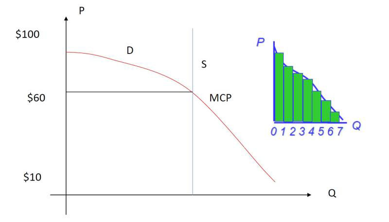 圖3所示的需求曲線是一條單調(diào)下降的曲線,也許可以解釋說(shuō)“價(jià)格隨著需求量的增加而降低”。但正確的解釋是:在一個(gè)市場(chǎng)中,有許多買(mǎi)家想購(gòu)買(mǎi)同樣的產(chǎn)品,他們的需求量和愿意支付的價(jià)格不一定相同。賣(mài)家在出售產(chǎn)品時(shí),肯定是從出價(jià)最高的買(mǎi)家選起,按價(jià)格從高到低依次選擇,先賣(mài)給出價(jià)高的買(mǎi)家,直到賣(mài)家的產(chǎn)品賣(mài)完或沒(méi)有買(mǎi)家剩下為止。這樣把買(mǎi)家的報(bào)價(jià)按價(jià)格由高到低進(jìn)行排隊(duì),匯總的如圖3右側(cè)所示的曲線就形成了需求曲線。