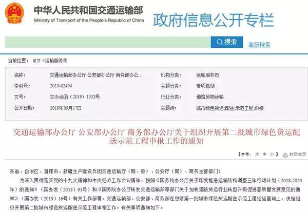 9月17日,交通運輸部、公安部、商務(wù)部聯(lián)合發(fā)布《關(guān)于組織開展第二批城市綠色貨運配送示范工程申報工作的通知》(以下簡稱《通知》)。自本月起,符合申報條件的城市,可按具體要求報送相關(guān)資料,審查結(jié)果將于2019年11月30日前確認(rèn)公布。2019年12月-2021年12月為具體實施階段,2022年1月—4月進(jìn)行項目驗收。