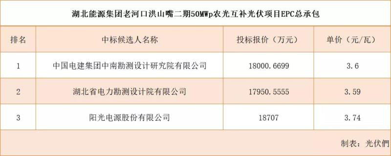 中國(guó)電建集團(tuán)中南勘測(cè)設(shè)計(jì)研究院有限公司以單價(jià)3.6元/瓦位列《湖北能源集團(tuán)老河口洪山嘴二期50MWp農(nóng)光互補(bǔ)光伏項(xiàng)目EPC總承包》第一中標(biāo)候選人、詳情如下: