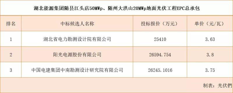 湖北省電力勘測(cè)設(shè)計(jì)院有限公司以單價(jià)3.63元/瓦位列《湖北能源集團(tuán)隨縣江頭店50MWp、隨州大洪山20MWp地面光伏工程EPC總承包》第一中標(biāo)候選人、詳情如下:
