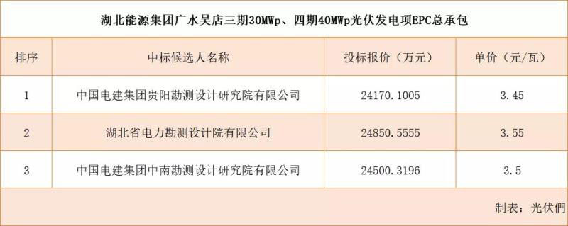 中國(guó)電建集團(tuán)貴陽勘測(cè)設(shè)計(jì)研究院有限公司以單價(jià)3.45元/瓦位列《湖北能源集團(tuán)廣水吳店三期30MWp、四期40MWp光伏發(fā)電項(xiàng)EPC總承包》第一中標(biāo)候選人,詳情如下: