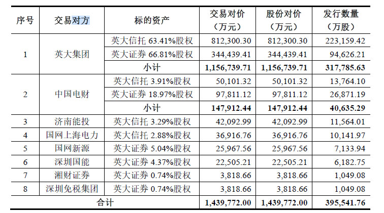 重組草案顯示,公司擬以發(fā)行股份的方式向交易對方購買英大信托73.49%股權(quán)和英大證券96.67%股權(quán),交易作價(jià)分別為94.14億元、49.84億元,合計(jì)143.98億元。