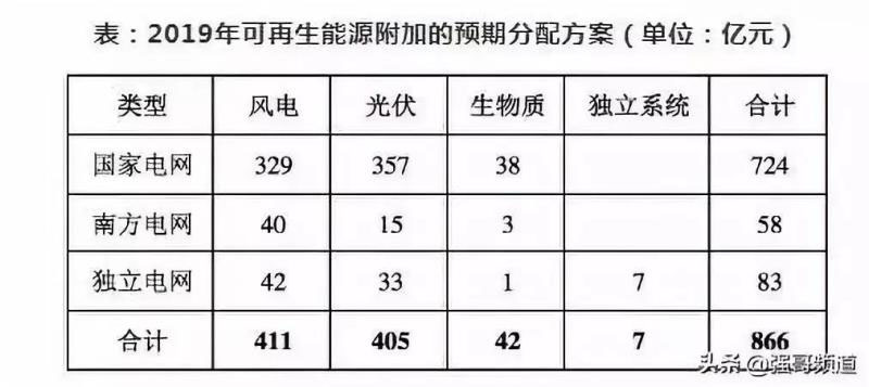 此前,據(jù)“國(guó)家可再生能源信息管理中心”的信息,2019年預(yù)期能收上來(lái)的866億元補(bǔ)貼,預(yù)期分配給光伏、風(fēng)電、生物質(zhì)、獨(dú)立系統(tǒng)的補(bǔ)貼額度分別為411億元、405億元、42億元和7億元,共計(jì)866億元。其中,預(yù)期分配給國(guó)家電網(wǎng)的補(bǔ)貼額度最高為724億元,預(yù)期分配給南方電網(wǎng)和獨(dú)立電網(wǎng)的補(bǔ)貼分別為58億元和83億元。
