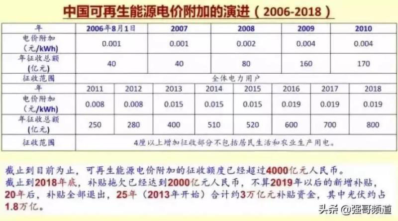 國(guó)家發(fā)改委能源研究所研究員王斯成測(cè)算,目前我國(guó)可再生能源電價(jià)附加的征收額度已超過(guò)4000億元人民幣。截至2018年底,補(bǔ)貼拖欠已達(dá)到2000億元人民幣,不包括2019年以后的新增補(bǔ)貼。20年后,補(bǔ)貼全部退出,從2013年算起25年合計(jì)約3萬(wàn)億元補(bǔ)貼資金,其中光伏約占1.8萬(wàn)億元。