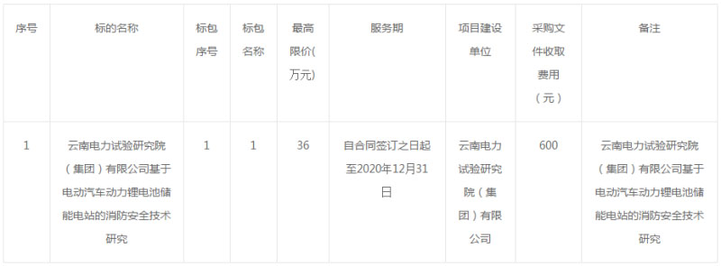 云南電力試驗(yàn)研究院(集團(tuán))有限公司基于電動(dòng)汽車動(dòng)力鋰電池儲(chǔ)能電站的消防安全技術(shù)研究采購(gòu)公告