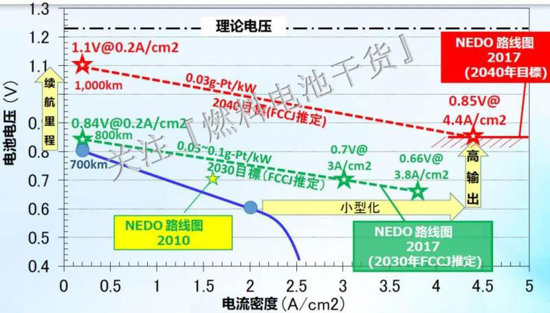 日本NEDO發(fā)布的燃料電池堆棧性能路線路中提出,至2040年,燃料電池堆最大負荷處對應(yīng)的工作電壓為0.85V@4.4A/cm2。下圖為日本NEDO在2017年發(fā)布的2040年燃料電池堆棧性能路線圖,其中2030年目標峰值功率工作電壓為0.66V@3.8A/cm2,催化劑擔載量0.05——0.1g/kW,0.2A/cm2電流密度對應(yīng)電壓0.84V;2040年目標峰值功率工作電壓為0.85V@4.4A/cm2,催化劑擔載量0.03g/kW,0.2A/cm2電流密度對應(yīng)電壓1.1V。