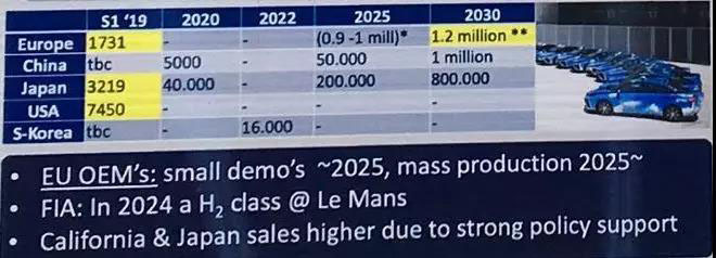 從銷量來看,美國最多,截止今年第一季度達到7450輛,日本次之,也有3219輛,歐洲氫燃料電池汽車銷量是1731輛(中國和韓國數(shù)據(jù)待確認)。如果按照李駿的數(shù)據(jù),中國與日本的銷量規(guī)模差不多。