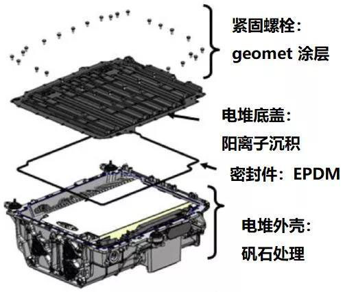 與傳統(tǒng)發(fā)動(dòng)機(jī)車輛相比,豐田Mirai燃料電池堆的安裝位置和工作溫度大不相同,具有不利的腐蝕環(huán)境。因底盤易遭受凍結(jié)、碎石和浸入,Mirai燃料電池堆需要良好的防銹措施。