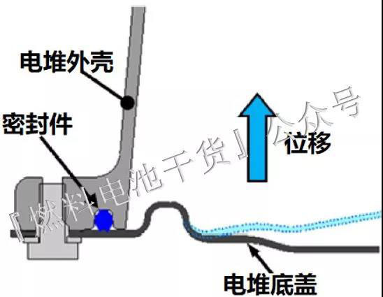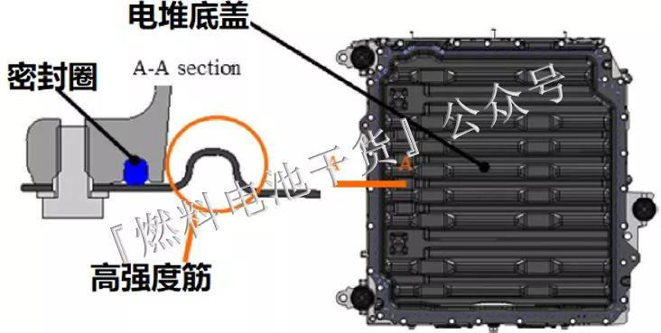下圖表示Mirai燃料電池堆防水設(shè)計(jì)的底蓋結(jié)構(gòu)。底蓋置于電堆下表面,暴露在燃料電池堆所承受的最大壓力處。Mirai通過保證底蓋和堆外殼之間密封圈的接觸壓力來實(shí)現(xiàn)有效防水,并且底蓋上設(shè)置有外部筋,以在密封件和接觸部分間獲得必要的剛度來實(shí)現(xiàn)有效壓力。