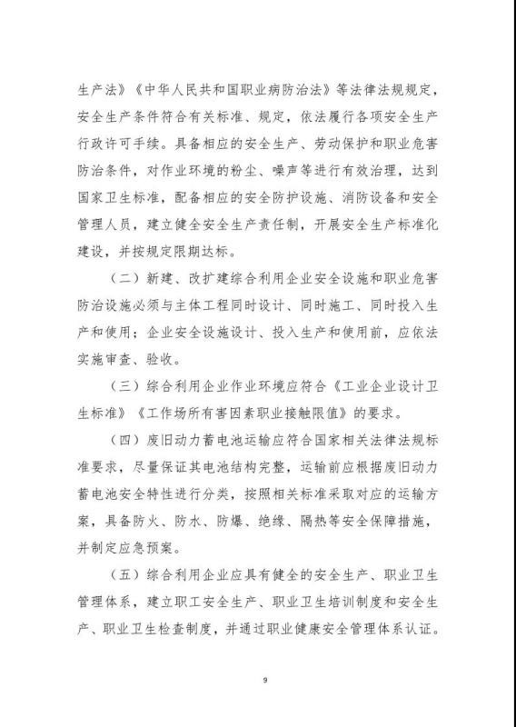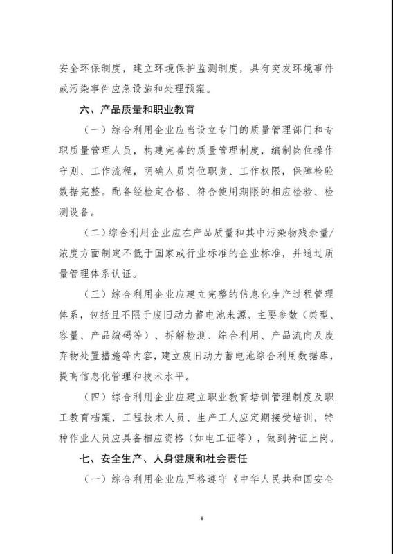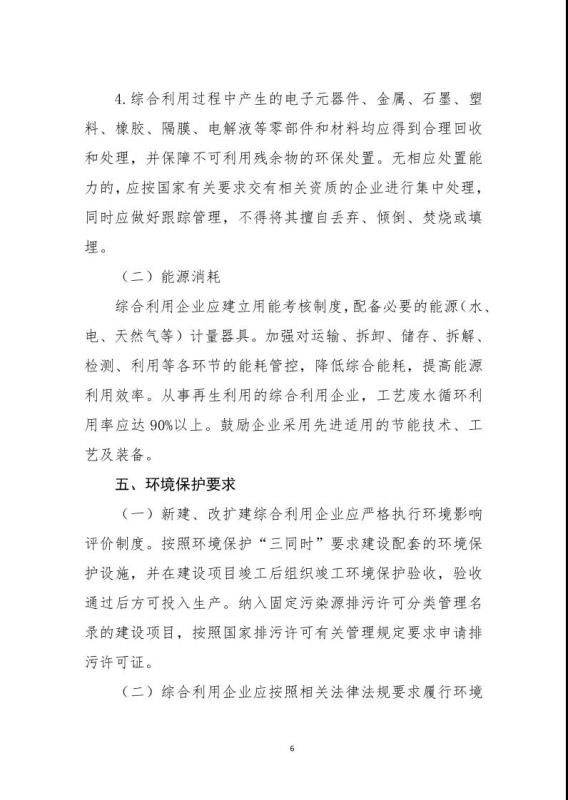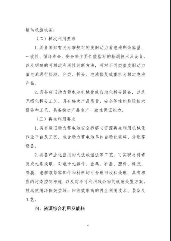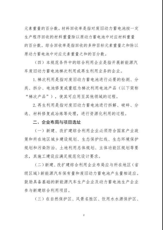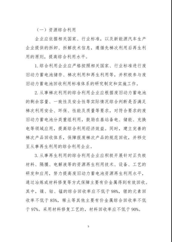 《規(guī)范條件》指出綜合利用企業(yè)是指開展新能源汽車廢舊動力蓄電池梯次利用或再生利用業(yè)務(wù)的企業(yè),該文件鼓勵具備基礎(chǔ)的新能源汽車生產(chǎn)企業(yè)及動力蓄電池生產(chǎn)企業(yè)參與新建綜合利用項目,鼓勵從事梯次利用的綜合利用企業(yè)在基站備電、儲能、充換電等領(lǐng)域應(yīng)用,提高綜合利用經(jīng)濟效益。