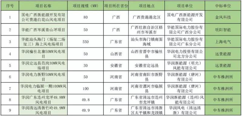 中國儲能網(wǎng)訊:近日,國電貴港白花山風電項目、華能廣西岑溪青山坪項目、華能汕頭海門(場址二、場址三)海上風電場項目等9個風電項目開標,規(guī)模共計1009.7MW,中標企業(yè)分別是:金風科技(80MW)、遠景能源(80MW)、明陽智能(50MW)、上海電氣(550MW)、中車株洲所(249.7MW),中標總價超58億元。