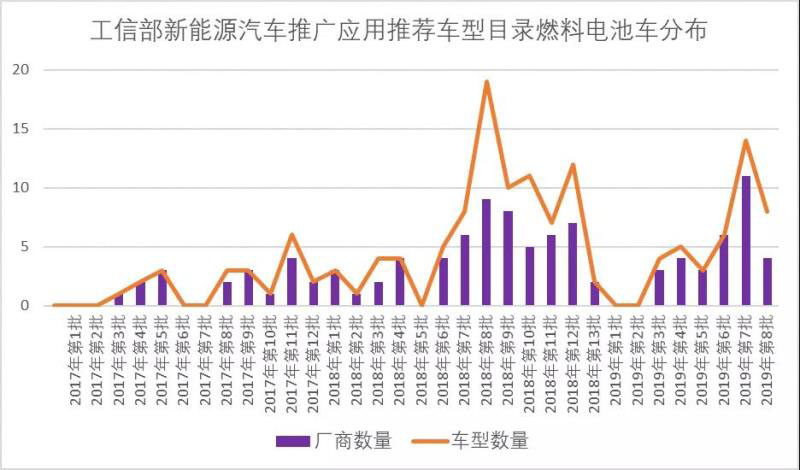 據(jù)國(guó)發(fā)能研院、綠能智庫統(tǒng)計(jì)數(shù)據(jù)顯示,工信部發(fā)布的新能源汽車推廣應(yīng)用推薦車型目錄中,商用的燃料電池車型從2018年起快速增多,涉及汽車廠商數(shù)量急劇增長(zhǎng)。相比2017年,2018年目錄中燃料電池車型數(shù)量和汽車廠商數(shù)量分別增長(zhǎng)309.5%和77.8%,2019年1-8月推出燃料電池汽車的廠商數(shù)量比2018年全年增長(zhǎng)31.3%。2019年第7批目錄中,11家廠商就推出了19款燃料電池汽車。