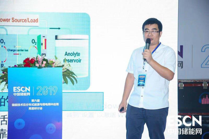 長沙理工大學教授、博導,湖南省團隊百人計劃負責人賈傳坤作《大規(guī)模儲能用低成本液流電池進展及思考》報告。