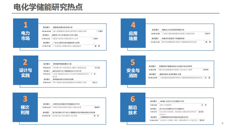 這次研討會研究的內(nèi)容,我們可以看到在主要重點在以下六個方面,包括電力市場的研究,儲能電池的設(shè)計與實踐,或是儲能電池的梯次利用、儲能的場景研究、儲能的本體安全、消防以及儲能的前沿技術(shù)??梢钥闯鰠⒓友杏憰钠髽I(yè)都想推動儲能技術(shù)的不斷發(fā)展,使得更多儲能項目的落地,獲得更多的經(jīng)濟收益。