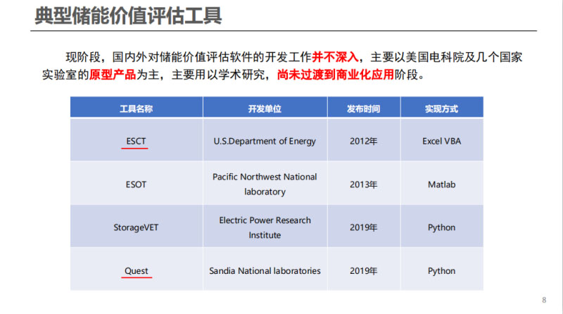 我們團隊從2016年開始到現(xiàn)在,也做了一些儲能價值評估項目,在做這些項目的過程中,雖然我們考慮得比簡單的Excel要多,但項目評估仍沒有形成整體的流程,也是沒有具體的軟件和優(yōu)化的過程,我們萌生了這個想法,想建立儲能價值的評估軟件,實現(xiàn)快捷、高效的評估計算,對項目有統(tǒng)一、整體的評估流程,我們希望有豐富的數(shù)據(jù)庫,對儲能的壽命進行準確的評估。我們團隊產(chǎn)生這個想法以后,我們最先做的工作是看看國內(nèi)外有沒有這方面成熟的價值評估軟件工具,想進行一些學習和參考,國內(nèi)外對儲能評估的工具不那么深入,開發(fā)處于原型階段,以學術(shù)研究為主,主要的產(chǎn)品是美國的產(chǎn)品。我們對這些產(chǎn)品進行學習、使用、研究,各個產(chǎn)品有各自的優(yōu)點和缺點,最大的缺點是因為中國和美國電力市場的大環(huán)境和政策上的差異,他們的軟件完全不適用于國內(nèi)的計算,最后我們團隊的想法是,自己進行設(shè)計與開發(fā),適用于國內(nèi)環(huán)境政策的儲能價值評估軟件。