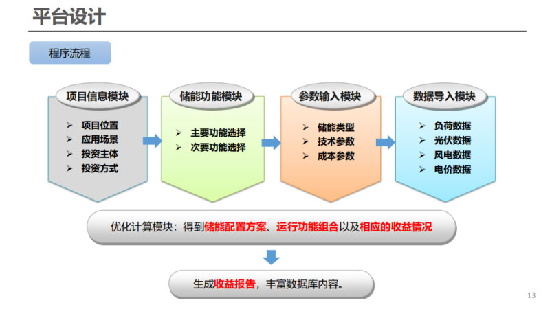 這是軟件的三大功能,儲能項目建設(shè)前有優(yōu)化配置的評估,得到儲能容量和配置方案,我們對工況進行仿真計算,我們可以計算出儲能的損耗。運行優(yōu)化是立足于已經(jīng)建立的儲能項目,我們想讓儲能項目實現(xiàn)多功能的綜合利用,通過功能組合的優(yōu)化,實現(xiàn)對不同的儲能功能進行優(yōu)化,得到組合的最優(yōu)方案,最終使得儲能利益最大化。通過靈敏度分析,我們對未來預(yù)期,儲能項目影響進行分析,儲能成本的變化、儲能類型的變化、經(jīng)濟利率條件對我們項目的影響、對方案收益的影響。這是我們程序的整體流程,主要包括信息的輸入模塊,通過優(yōu)化計算得到儲能的配置方案、運行功能組合和收益情況,最終能夠提供收益報告分析。