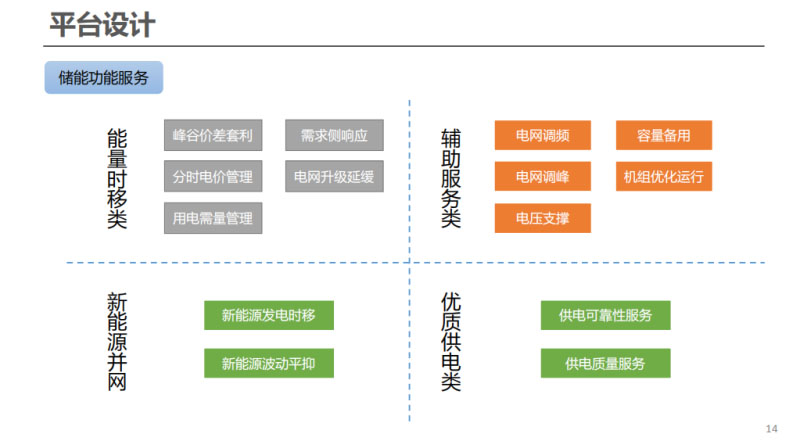 這是儲能功能服務(wù)這塊,上午有專家提到電網(wǎng)側(cè)、電源側(cè)、用戶側(cè)存在的具體功能,我們對這14種功能進行一些收益上的建模,對組合功能進行收益分析。最主要的組合功能就是通過配置合理的功率和容量,使得儲能可以承擔多個功能的應(yīng)用,發(fā)揮儲能的價值,典型的儲能組合功能包括用戶側(cè)、電網(wǎng)側(cè)和發(fā)電側(cè)的組合功能。