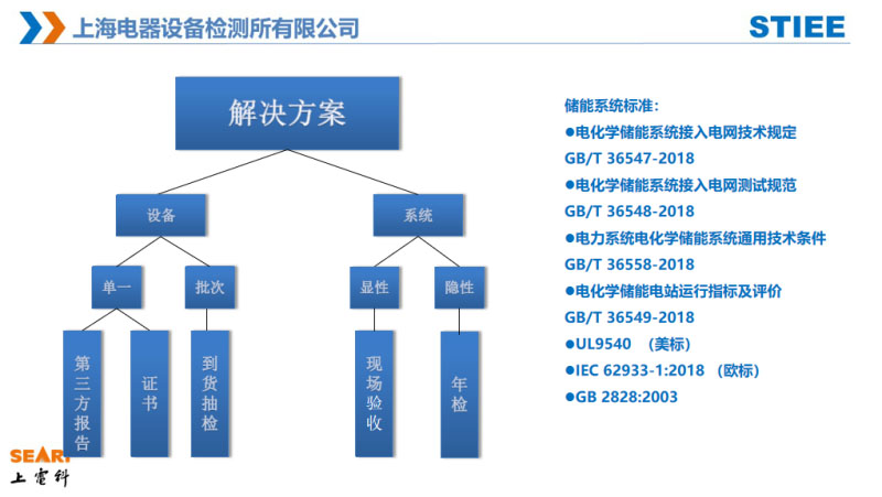 由于儲(chǔ)能電站應(yīng)用越來(lái)越廣,國(guó)家也出臺(tái)一系列的標(biāo)準(zhǔn),國(guó)內(nèi)已經(jīng)推出GB/T 36548、GB/T36558等一系列的標(biāo)準(zhǔn),對(duì)儲(chǔ)能電站接入電網(wǎng)有一些要求。歐美有UL9540和IEC62933等標(biāo)準(zhǔn)。針對(duì)單一設(shè)備我們可以做到第三方報(bào)告和證書(shū),批次設(shè)備可以根據(jù)GB/T2828進(jìn)行到貨抽檢,一些儲(chǔ)能電站剛開(kāi)始沒(méi)有發(fā)現(xiàn)問(wèn)題,但是運(yùn)行到一定時(shí)間可能會(huì)產(chǎn)生一些安全上的隱患,預(yù)防性的年檢也是必不可少的。