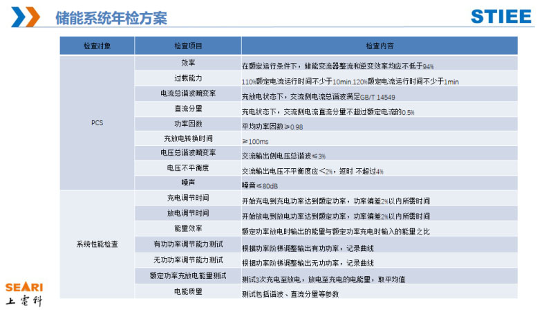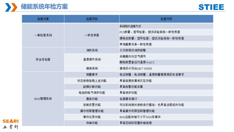 這是我們儲(chǔ)能系統(tǒng)電站的現(xiàn)場(chǎng)年檢方案,包括一致性檢查、安全性檢查、設(shè)備檢查、系統(tǒng)性檢查。安全性的檢查考慮安全系統(tǒng)、溫控、接地是否與設(shè)計(jì)符合。BMS根據(jù)GB/T34131標(biāo)準(zhǔn)進(jìn)行驗(yàn)收,如故障診斷、通信等。系統(tǒng)性的檢查主要是有功、無(wú)功、電網(wǎng)性的測(cè)試項(xiàng)目還有一些高低穿的測(cè)試項(xiàng)目。