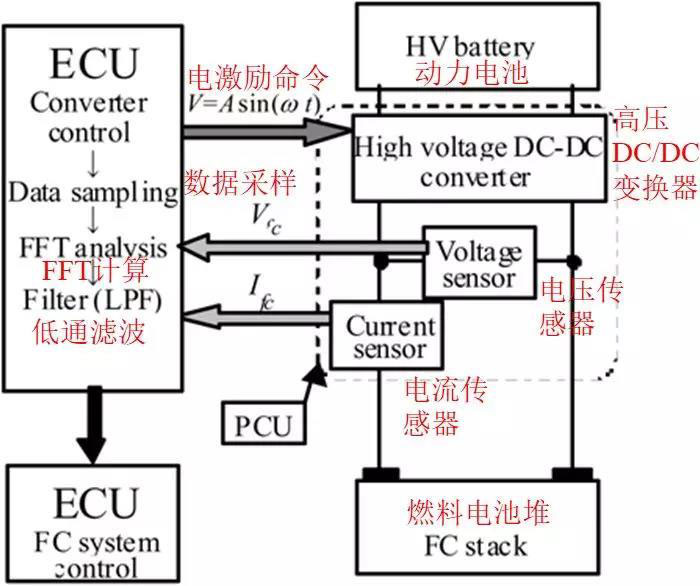 下圖為豐田燃料電池系統(tǒng)交流阻抗測量技術(shù)原理。從電氣配置角度講,具備高壓DC/DC變換器、電流傳感器、電壓傳感器。其中,高壓DC/DC變換器與燃料電池堆正負(fù)極相連,用于對(duì)燃料電池堆施加電激勵(lì)信號(hào);電流傳感器用于測量燃料電池堆的輸出電流;電壓傳感器用于測量燃料電池堆的輸出電壓。盡管豐田MIRAI燃料電池動(dòng)力系統(tǒng)構(gòu)型與下圖有差異,但對(duì)燃料電池堆施加電激勵(lì)信號(hào)均為DC/DC變換器,只是DC/DC變換器主要服務(wù)對(duì)象從動(dòng)力電池?fù)Q成了燃料電池,在此不作區(qū)分。