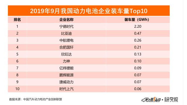 企業(yè)方面,2019年9月,我國新能源汽車市場共計(jì)52家動(dòng)力電池企業(yè)實(shí)現(xiàn)裝車配套,較8月份增加8家。排名前3家、前5家、前10家動(dòng)力電池企業(yè)動(dòng)力電池裝車量分別為2.9GWh、3.3GWh和3.6GWh,占總裝車量比分別為74.0%、82.5%和92.0%。