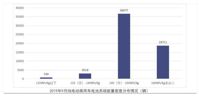 純電動(dòng)乘用車電池系統(tǒng)能量密度分布來看,2019年9月,我國純電動(dòng)乘用車系統(tǒng)能量密度在160Wh/kg及以上區(qū)間產(chǎn)量共計(jì)1.9萬輛,占純電動(dòng)乘用車總產(chǎn)量由26.3%上升至31.6%;在125(含)-140Wh/kg和140(含)-160Wh/kg以上區(qū)間的車型產(chǎn)量分別為0.3萬輛和3.7萬輛,分別占純電動(dòng)乘用車總產(chǎn)量5.1%和62%。