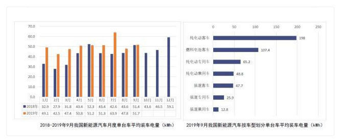 從單臺(tái)車平均裝車電量情況來看,2019年9月,受新能源客車產(chǎn)量小幅上升帶動(dòng),我國新能源汽車按車型劃分的平均裝車電量51.7.8kWh,環(huán)比上升8.2%。