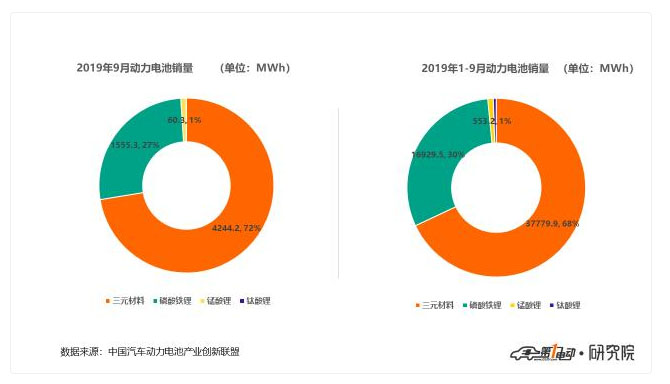 2019年1-9月,我國動(dòng)力電池累計(jì)銷量達(dá)55.6GWh,其中三元電池累計(jì)銷售37.8GWh,占總銷量68%;磷酸鐵鋰電池累計(jì)銷售16.9GWh,占總銷量比30.5%。磷酸鐵鋰電池市場較去年同期仍存在一定差距。