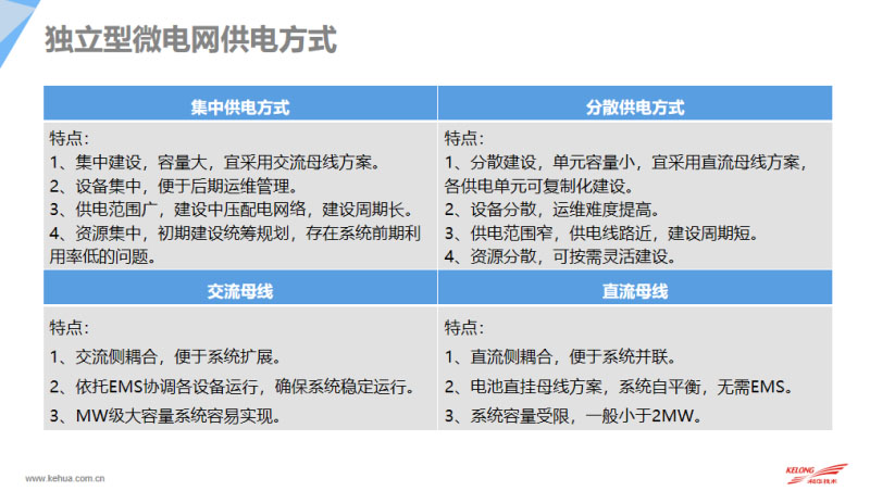 目前集中供電和分散供電都是有它的優(yōu)缺點(diǎn),對(duì)于集中供電的容量大,需要用交流母線方案,通過(guò)EMS協(xié)調(diào)各設(shè)備的運(yùn)行,同時(shí)集中供電的方案在前期負(fù)載不多的情況下存在可用率比較低,因?yàn)榧泄╇?,所有微網(wǎng)儲(chǔ)能都是集中布局,對(duì)于運(yùn)維管理存在優(yōu)勢(shì)。分散供電的單元容量小,是可以做一個(gè)復(fù)制化的建設(shè),但是它的運(yùn)維難度相對(duì)來(lái)說(shuō)比較高。整個(gè)容量比較小的話我們直接采用直流母線的方案,其實(shí)可以便于做系統(tǒng)的自平衡,無(wú)需EMS系統(tǒng)實(shí)現(xiàn),這樣的話整個(gè)系統(tǒng)的穩(wěn)定性相對(duì)來(lái)說(shuō)會(huì)更高一點(diǎn)。