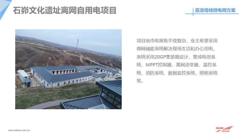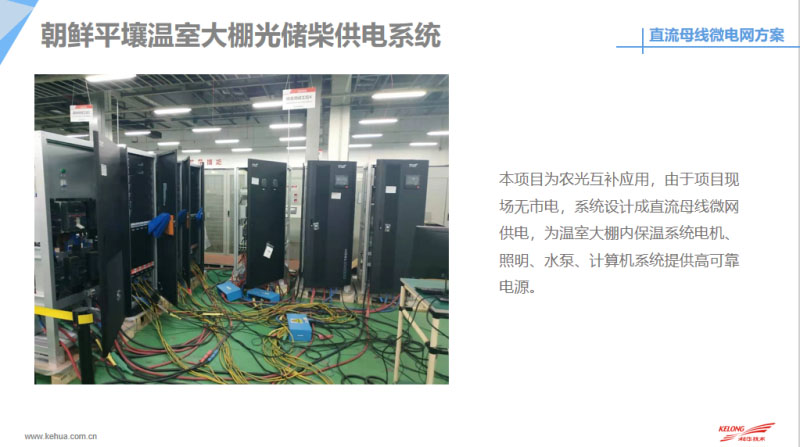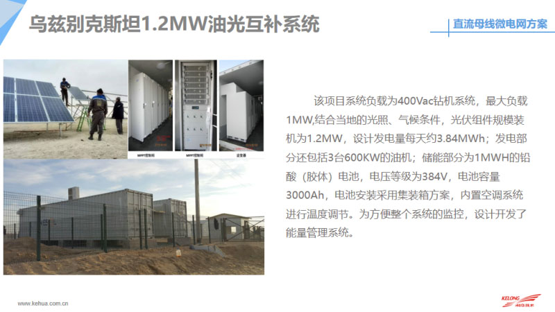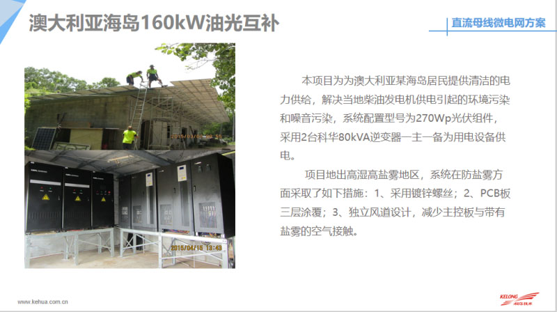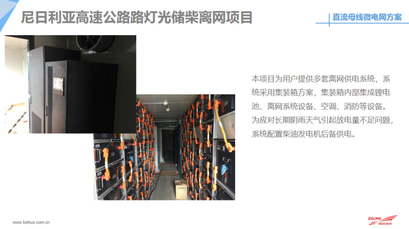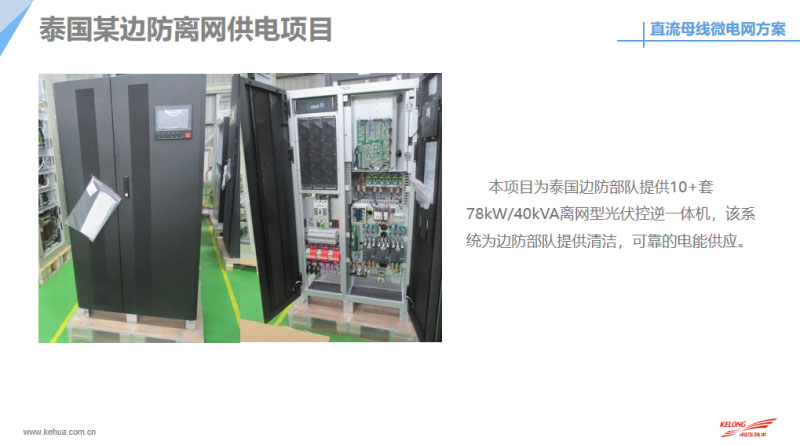 最后和大家分享一下目前我們科華恒盛在國(guó)內(nèi)外做的微網(wǎng)案例,包括目前在國(guó)內(nèi)外做了很多直流的離網(wǎng)供電,這是我們?cè)诜侵蘅溌∽龅碾x網(wǎng)供電,目前系統(tǒng)已經(jīng)斷斷續(xù)續(xù)出貨165套的離網(wǎng)系統(tǒng),系統(tǒng)容量大概是15千伏安到200千伏安不等。