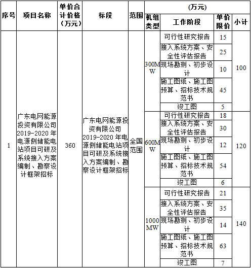 廣東電網(wǎng)能源投資有限公司2019-2020年電源側(cè)儲(chǔ)能電站項(xiàng)目可研及系統(tǒng)接入方案編制、勘察設(shè)計(jì)框架招標(biāo)開標(biāo)記錄
