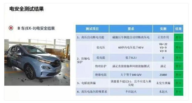 在實(shí)驗(yàn)中,等紅燈的北汽新能源EX3被后車以50km/h時(shí)速追尾,隨后又被正常通過綠燈的車輛以50km/h時(shí)速撞擊側(cè)面。在后、側(cè)兩次強(qiáng)大的碰撞下,北汽新能源EX3的A柱、B柱,門梁沒有出現(xiàn)變形,駕駛艙保持了良好整體性,碰撞中車門沒有被撞開,碰撞后車門也能正常打開。在測試結(jié)束后公布的數(shù)據(jù)顯示,北汽新能源的電安全測試結(jié)果全部合格。