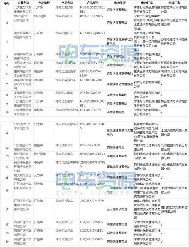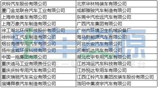 安徽華菱汽車有限公司、安徽泰新汽車工業(yè)有限公司、北汽(常州)汽車有限公司、北汽福田汽車股份有限公司、比亞迪汽車工業(yè)有限公司、程力汽車集團股份有限公司、福建龍馬環(huán)衛(wèi)裝備股份有限公司、遼寧航天凌河汽車有限公司、南通皋開汽車制造有限公司、上汽大通汽車有限公司、四川現代汽車有限公司、徐州徐工環(huán)境技術有限公司、揚州三源機械有限公司、一汽解放青島汽車有限公司、長城汽車股份有限公司、長沙中聯(lián)重科環(huán)境產業(yè)有限公司、鄭州宇通集團有限公司、中國第一汽車集團有限公司和中國重汽集團柳州運力專用汽車有限公司。