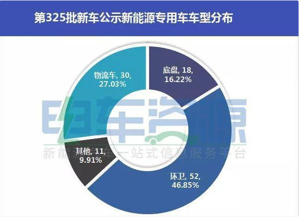 電車資源整理第325批新車公示111款新能源專用車車型分布,其中環(huán)衛(wèi)車以52款車型,占比46.85%;物流車以30款車型占比27.03%;18款底盤占比16.22%,其他車型11款,占比9.91%。