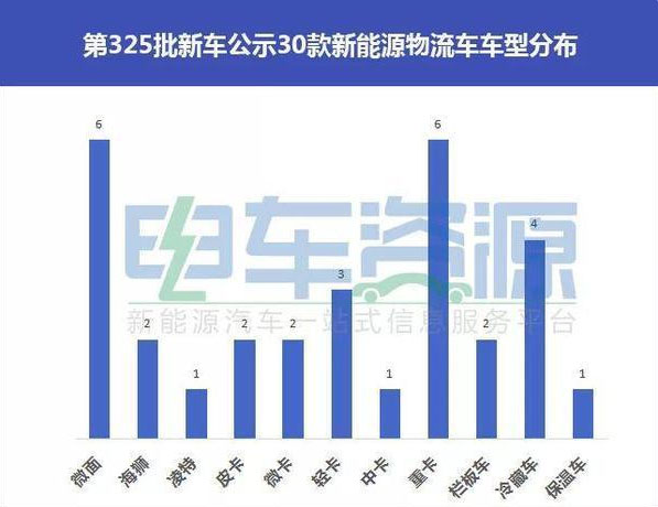 本次新車公示30款新能源物流車中,包含了6款微面車型、2款海獅車型、1款凌特車型、2款皮卡車型、2款微卡車型、3款廂式輕卡車型、1款廂式中卡車型、6款重卡車型、2款欄板車車型、4款冷藏車車型和1款保溫車車型。