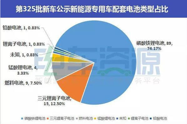據電車資源統(tǒng)計,本次新車公示111款新能源專用車電類型中,磷酸鐵鋰電池以配套89款車型,占總配套74.17%;三元材料鋰電池以15款配套占比12.50%;燃料電池配套9款車型,占比7.50%;4款車型配套錳酸鋰電池,占比3.33%。另外,此次新車公示中有1款車型未標明電池材料,1款車型僅標明鋰電池和1款車型配套鉛酸電池。
