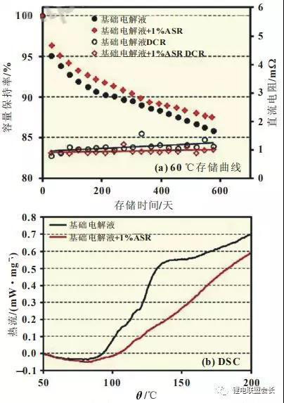 因?yàn)殡姵馗邷卮鎯?chǔ)過(guò)程中的容量損失主要來(lái)自陽(yáng)極表面的副反應(yīng)造成的活性鋰離子損失,所以在電解液中添加SEI膜熱穩(wěn)定添加劑(ASR)可以提升SEI膜的高溫穩(wěn)定性,降低陽(yáng)極表面的副反應(yīng)活性,減少活性鋰離子損耗。