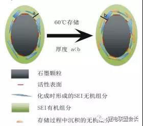 綜上所述,在高溫存儲(chǔ)過(guò)程中,嵌鋰態(tài)陽(yáng)極長(zhǎng)期處于低電位狀態(tài),電解液還原反應(yīng)消耗活性鋰離子,最終生成無(wú)機(jī)鋰鹽;高溫增加了電解液還原反應(yīng)速率,使活性鋰離子大量損失(圖6)。此外,陽(yáng)極副反應(yīng)產(chǎn)物沉積、SEI膜增厚,造成電極動(dòng)力學(xué)性能變差。