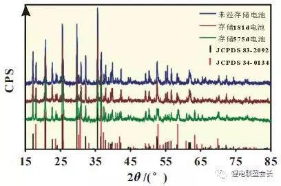 圖2 不同存儲(chǔ)時(shí)間的電池陰極的XRD譜圖
