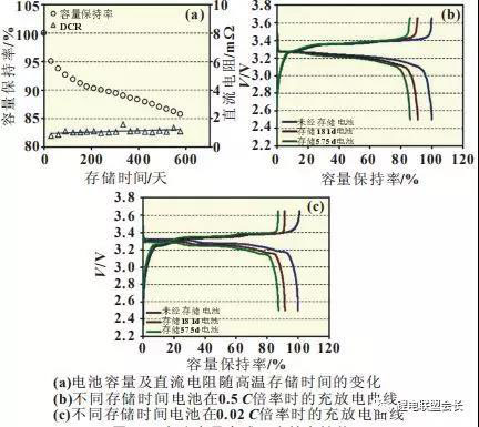 100%SOC電池60℃存儲(chǔ)一定時(shí)間后,在2.50~3.65V之間以0.5C倍率進(jìn)行一次放電-充電循環(huán)。然后將滿充電池繼續(xù)在60℃存儲(chǔ)。如此反復(fù),記錄電池的容量衰減過(guò)程。在每次容量測(cè)試過(guò)程中,測(cè)試電池5C/30s的直流內(nèi)阻(DCR)。